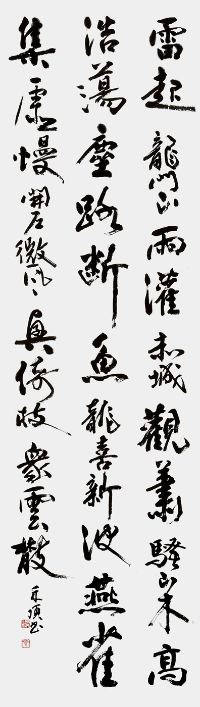 詩の風景を想像しながら、作品全体をやや固の筆と濃墨で、重厚な線質と小粒な文字を入れ、造形美を追及して書き進めました。