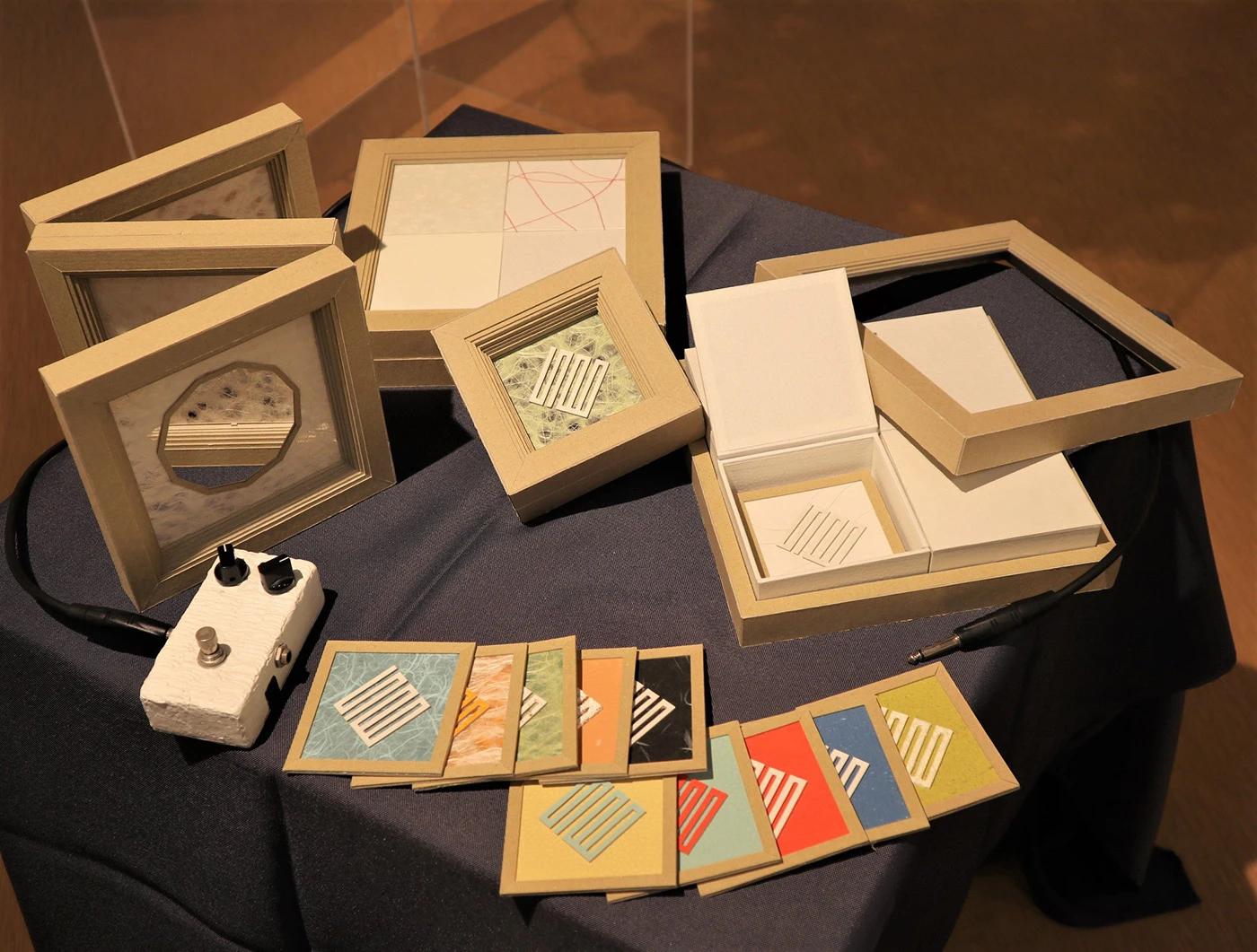黄ボール紙を使った枠を作ることは高校生の頃からしており、父や母、友人などの記念日に花を添えたりして贈っていたのですが、今回は自分の好きな音楽に対してこの手法を使って表現できればと思い制作しました。好きなアーティストの内、今回はTHE SPELLBOUND、THE NOVEMBERSにフォーカスしています。紙にも拘っていますので近くでご覧いただきたいです。