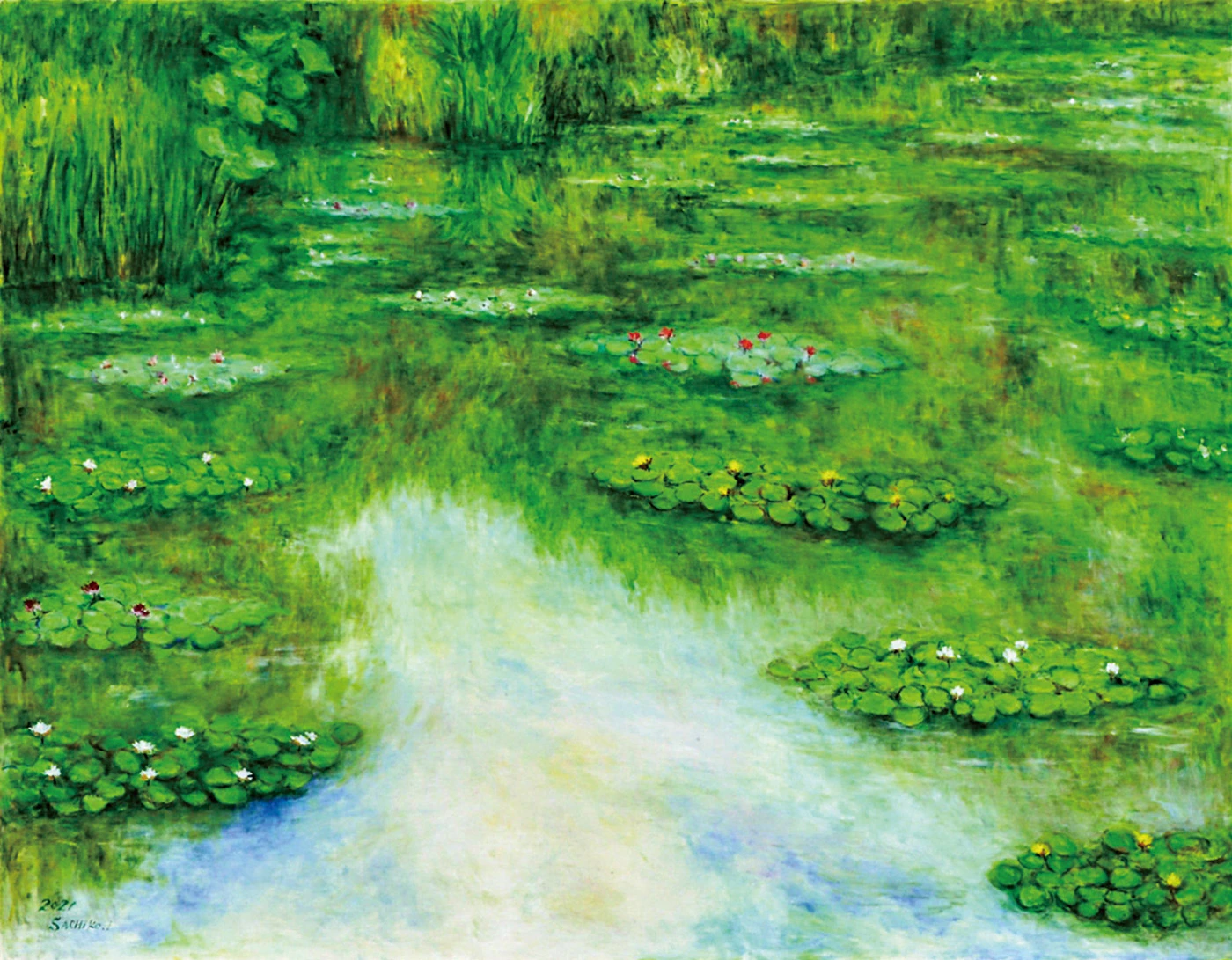 水に映る木々を描くのが好きです。フランス・ジヴェルニーにあるモネの庭。それを模した池が浜名湖にあることを知り、すぐに出向き、その場で筆を走らせました。