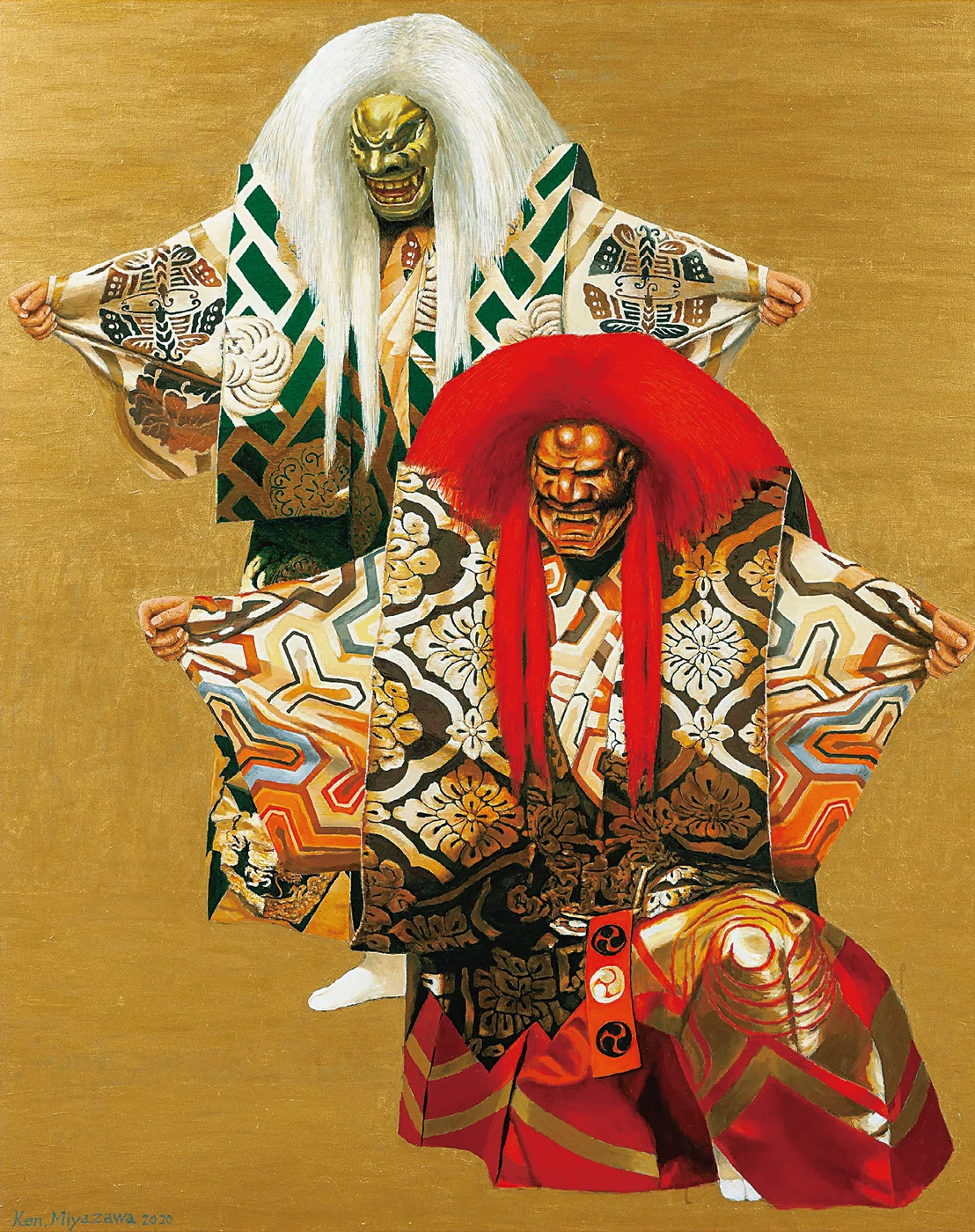 絵画の持つ特性の1つである装飾性を特に意識して追求してみた作品です。能の「石橋(しゃっきょう)」を画題とし、赤獅子と白獅子の鮮やかな対比した姿を、あでやかに豪壮に金地のバックの中に表現しました。