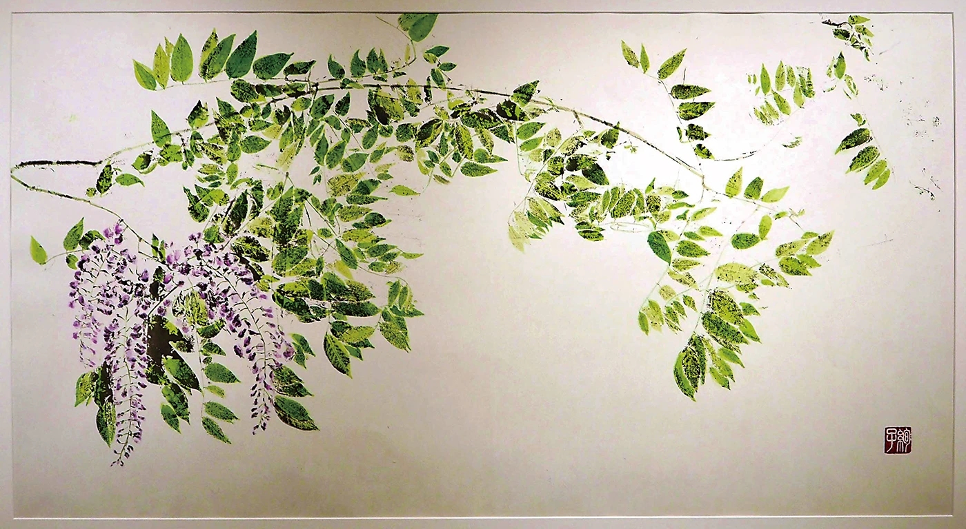 年に一度の“神と紙の里の春祭り”のため越前和紙の里へ車で向かう途中、山の中で見つけた山藤の枝を分けていただき、紙の神様の祀られた神社の真横にある友人宅の軒先で摺らせてもらった1枚です。越前でいただいた枝を越前の紙に越前で拓画できました。