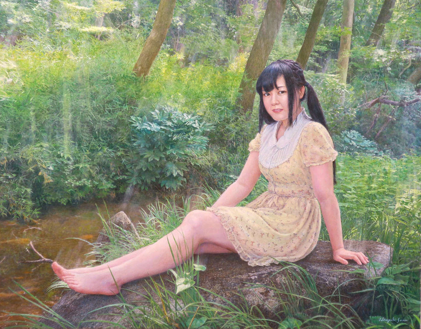 松戸市の「21世紀の森」の中にある木もれ陽の森で取材しました。木々の間から差し込む光が清々しく、人物よりも周囲の風景の方に時間をかけて描き上げました。