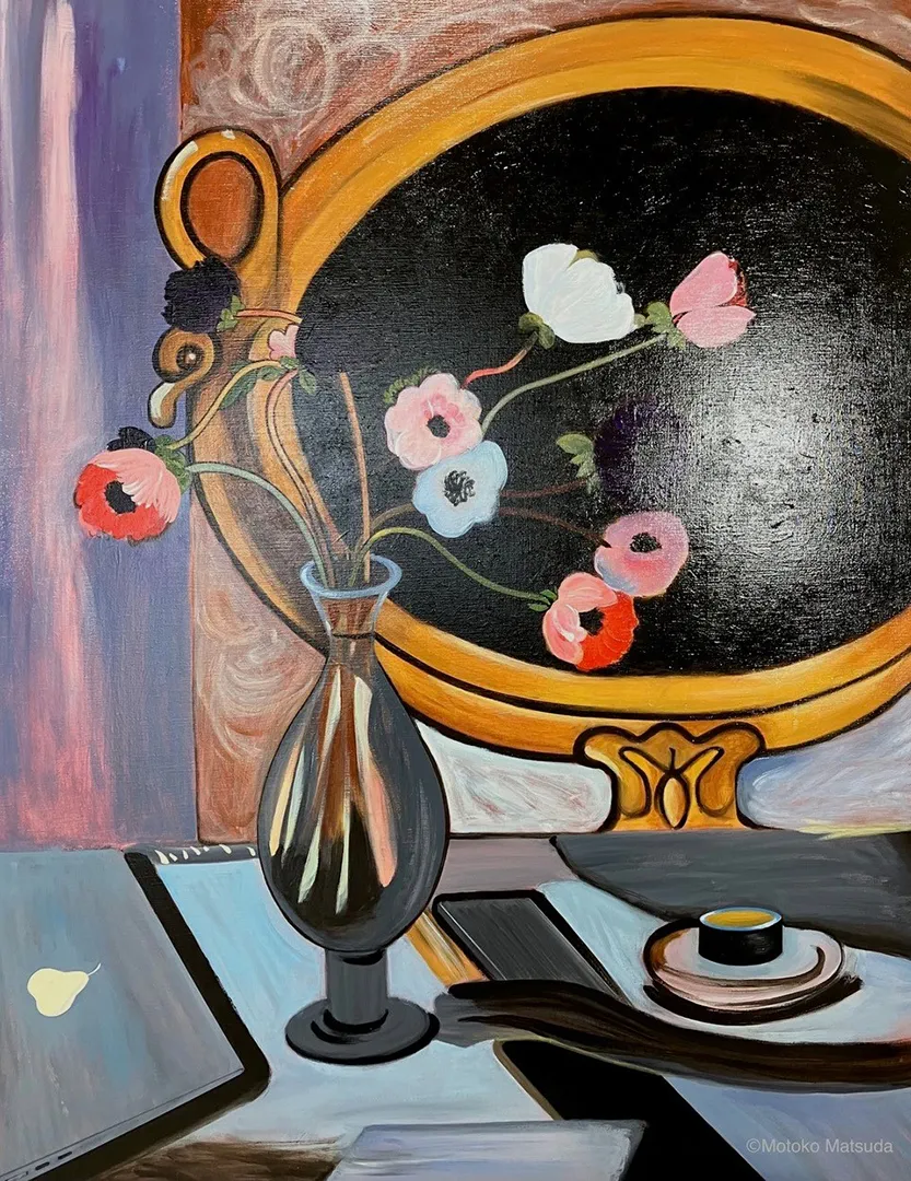 いくつかある自分の作品のシリーズのひとつです。「マスターズ+(プラス)シリーズ」といい、過去の名作から着想を得ています。アンリ・マティスの1910?20年頃の室内画に興味があり、その作品群の一つに、現代のデジタル・デバイスを配置しました。時間を越えて、過去と現在がつながることを表現しています。オリジナルは1918?1919年冬に描かれました。