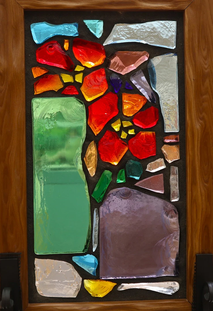 - ダル・ド・ヴェールはステンドグラスの中でも特殊なステンドグラスです。ダル・ド・ヴェール(フランス語でDalle de verre)とは、一般的なステンドグラスで使われる3mm程度のガラスでなく、25mmくらいの分厚いガラスをハンマーでカットしパーツを作り、レンズ上のエグリ等も装飾してセメントや樹脂で固めて一枚のパネル状にする技法です。