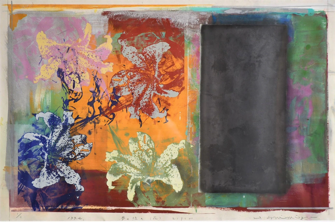 ユリの花をシルクスクリーンの版におこし、いくつかの描画材を用い構成したもの。