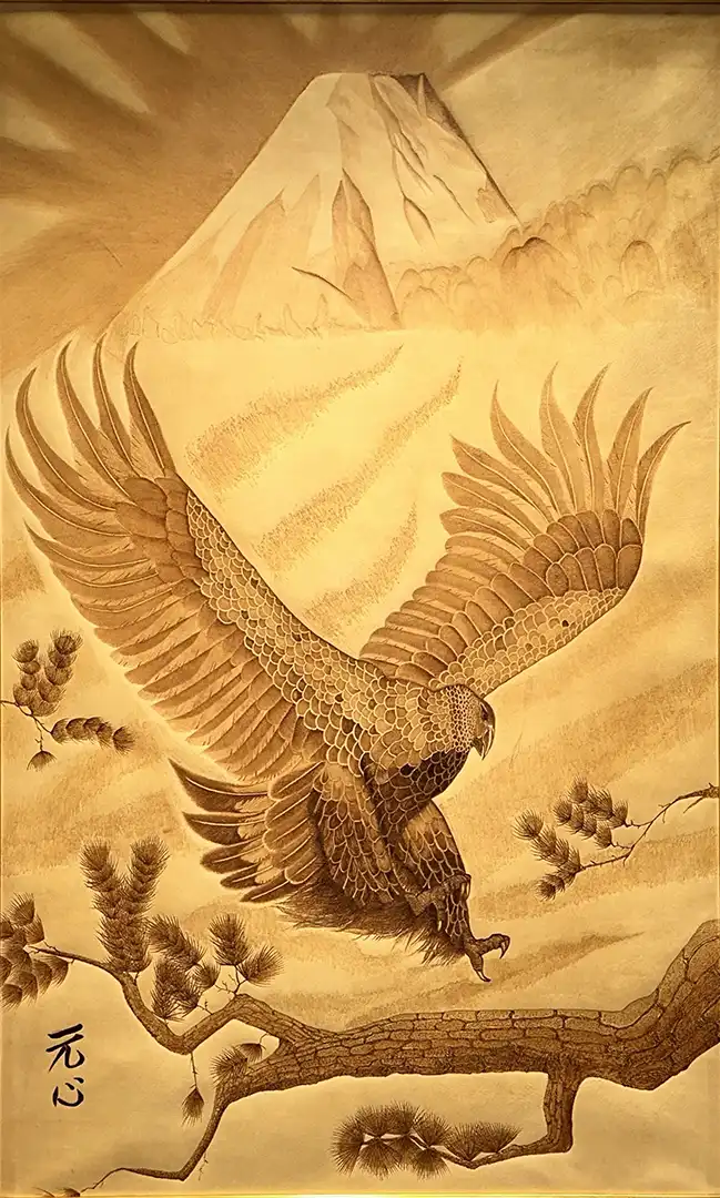 大空へ羽ばたく雄大な鷹のように世界へ羽ばたき、自分自身が病魔と闘い、まさしく生きてく様を表現。
